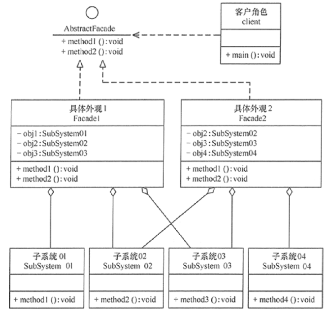 在外观模式中,当增加或移除子系统时需要修改外观类,这违背了“开闭原则”。如果引入抽象外观类,则在一定程度上解决了该问题,其结构图如图。