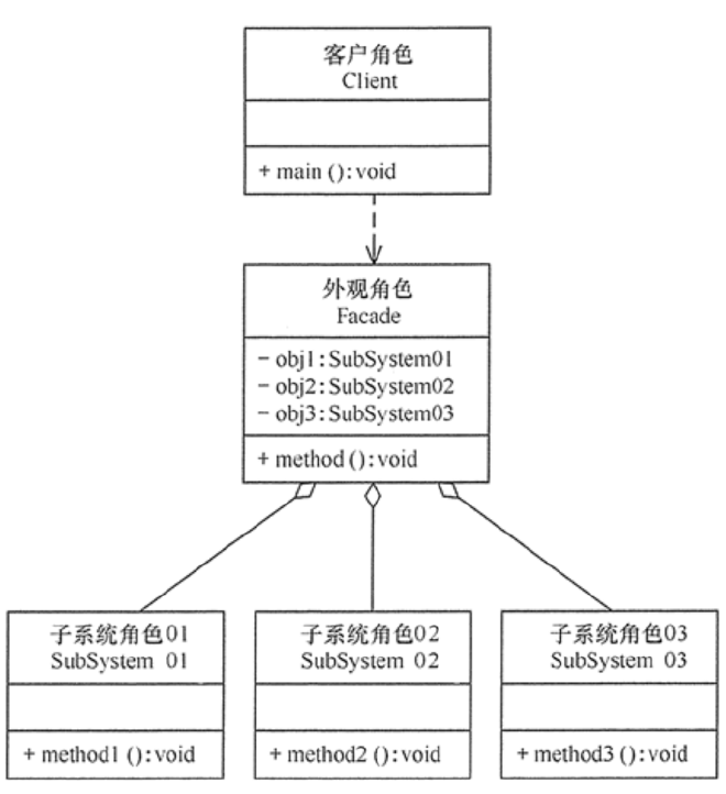 - 客户(Client)角色:通过一个外观角色访问各个子系统的功能。