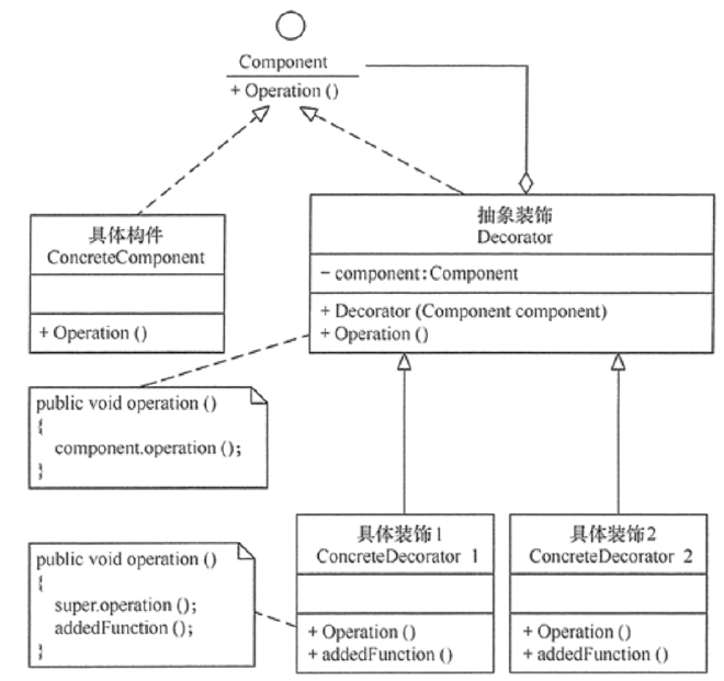 - 抽象构件(Component)角色:定义一个抽象接口以规范准备接收附加责任的对象。