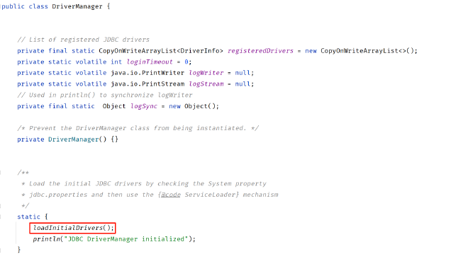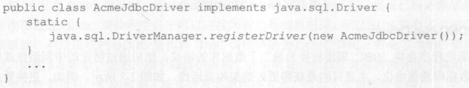 所有的JDBC驱动都必须实现Driver接口,而且实现类必须包含一个静态初始化代码块。我们知道,类的静态初始化代码块会在类初始化时调用,驱动实现类需要在静态初始化代码块中向DriverManager注册自己的一个实例,例如: