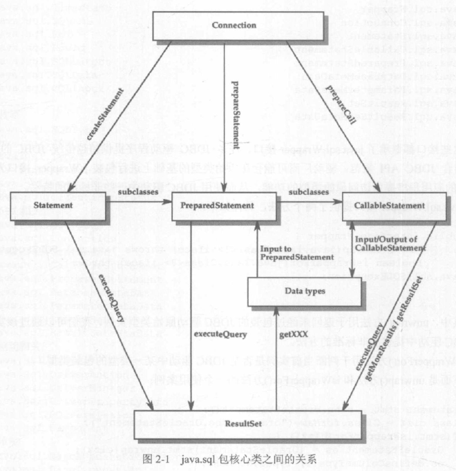 Connection conn = ds.getConnection(user, passwd); PreparedStatement ps = conn.prepareStatement("INSERT INTO BOOKLIST""(AUTHOR,TITLE,ISBN) VALUES(?,?,?)"); ps.setString(l,"Zamiatin,Evgenii"); ps.setString(2,"we"); ps.setLong(3,140185852L); // 我们在使用setXXXO方法为参数占位符设置值时存在一个数据转换过程。 // setXXXO方法的参数为Java数据类型,需要转换为JDBC类型(java.sql.Types中定义的SQL类型), // 这一过程由JDBC驱动来完成。ParameterMetaData pmd = stmt.getParameterMetaData(); for(int i = 1; i <= pmd.getParameterCount(); i++) { String typeName = pmd.getParameterTypeName(i); String className = pmd.getParameterClassName(i); System.out.println("第" + i + "个参数," + "typeName:" + typeName + ", className:" + className); } //第1个参数,typeName:VARCHAR, className:java.lang.String //第2个参数,typeName:VARCHAR, className:java.lang.String //第3个参数,typeName:VARCHAR, className:java.lang.String //第4个参数,typeName:VARCHAR, className:java.lang.String //第5个参数,typeName:VARCHAR, className:java.lang.String - CallableStatement接口继承自PreparedStatement,在此基础上增加了调用存储过程以及检索存储过程调用结果的方法(connection.prepareCall()创建)。
